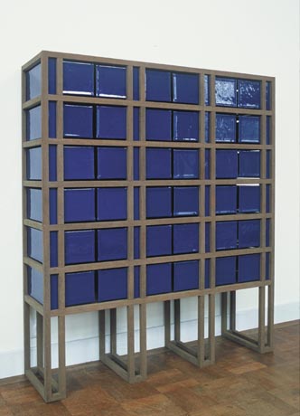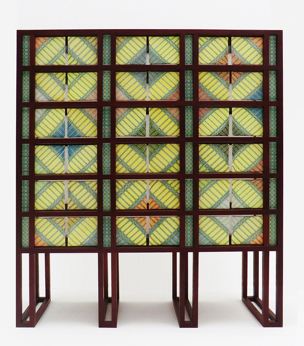 I designed compositions of flat panels, with patterns of melted, colored glass threads. The glass panels are placed as revolving doors in the wooden cabinet.