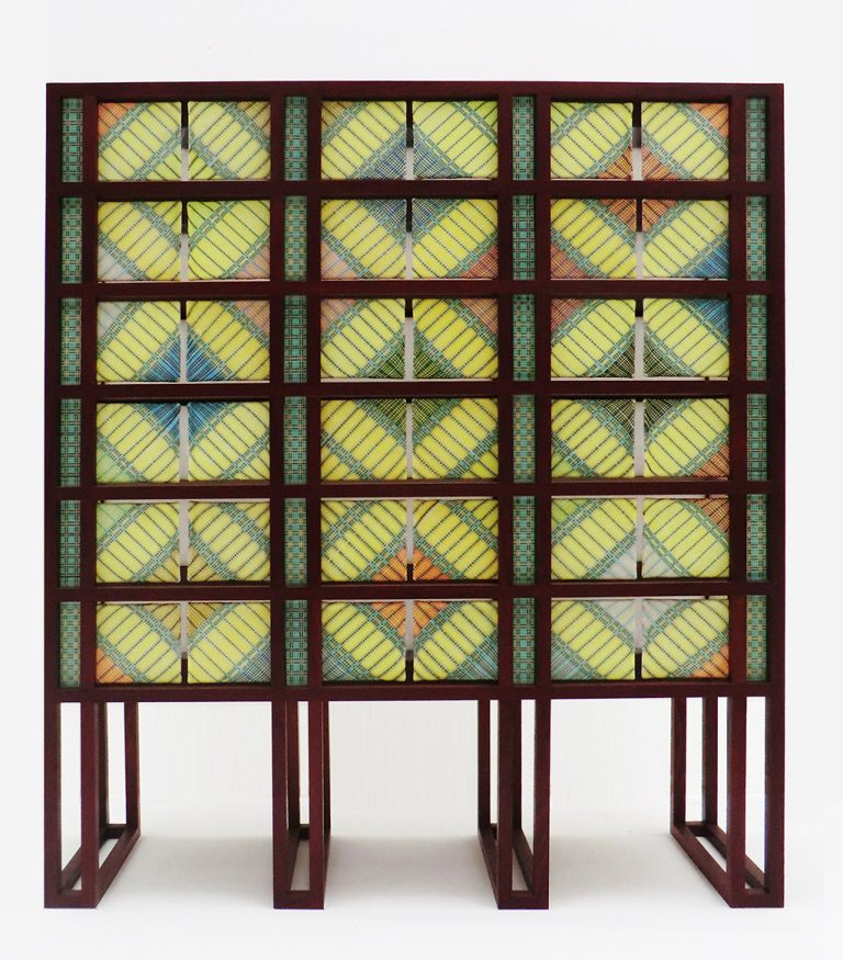 Ik ontwierp composities van vlakglas panelen, waarin patronen van gekleurde glas draden zijn versmolten. Deze zijn als draaiende deurtjes in de houten kast geplaatst.