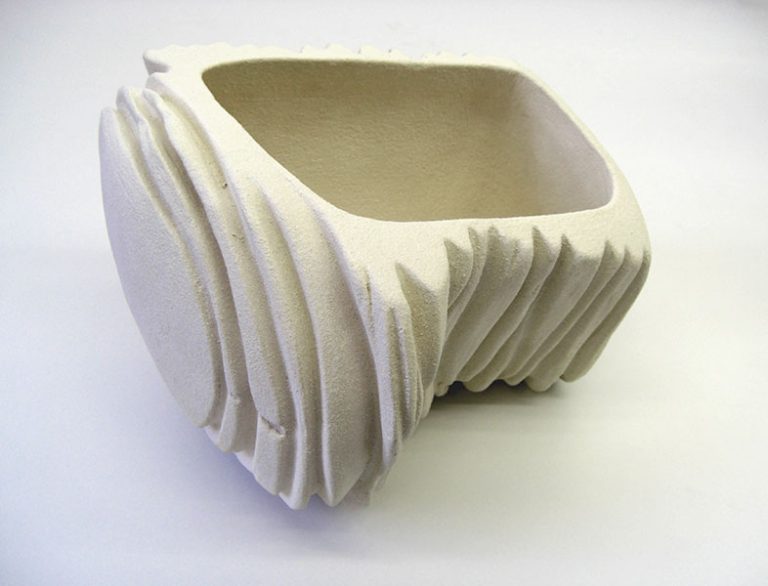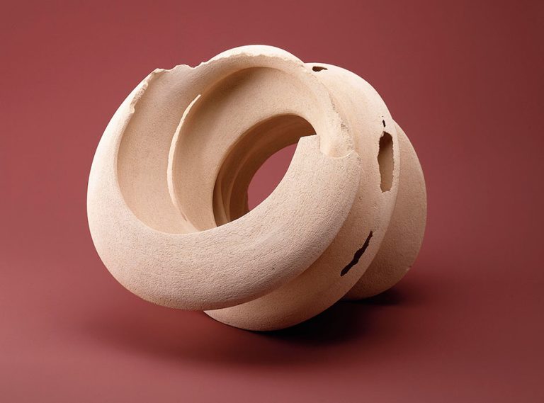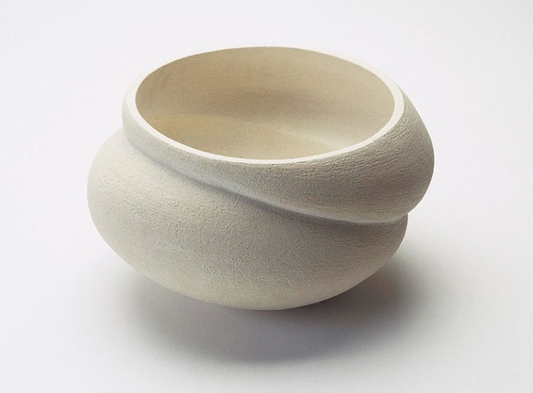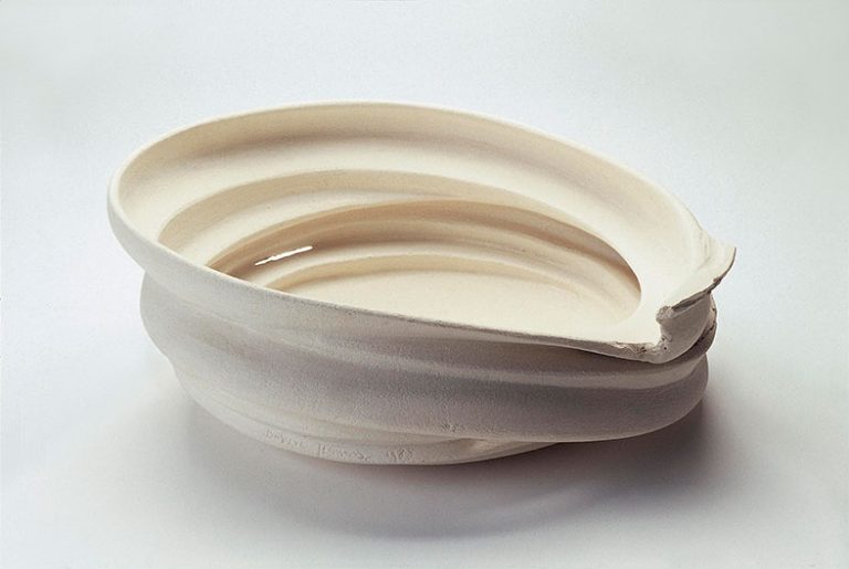 “The barrenness, the monochrome quality, the purity appealed to me enormously. These impressions led to unglazed, turned pots and vases, which were circumvented with rope, causing bulges to arise between the constrictions. This was the beginning of the series of Fossil forms, which emerged from a sort of spiral shape. First the cylinder of wet clay, wrapping a rope around it and then turning the clay outward through the pressure of my hands. In a subsequent phase I cut out the bottoms and laid these turned forms on their sides, so that a pot or vase became a free object.”